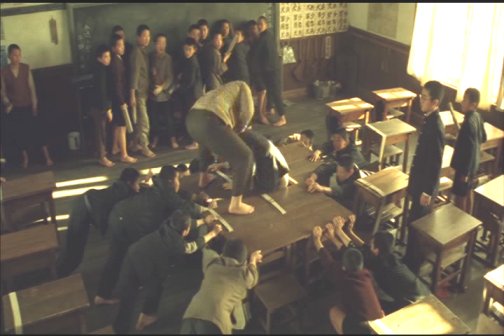 In a well co-ordinated move they push the desks to surround Ohara, trapping him. Futoshi gets on top of the desks and attacks (Ohara had beaten up him on a regular basis.)
