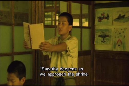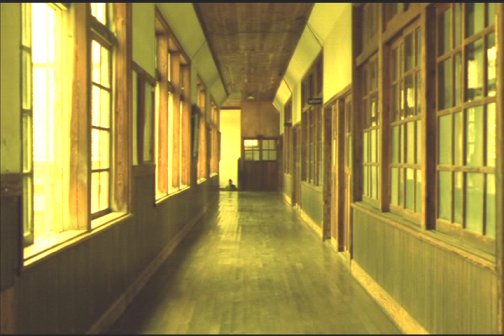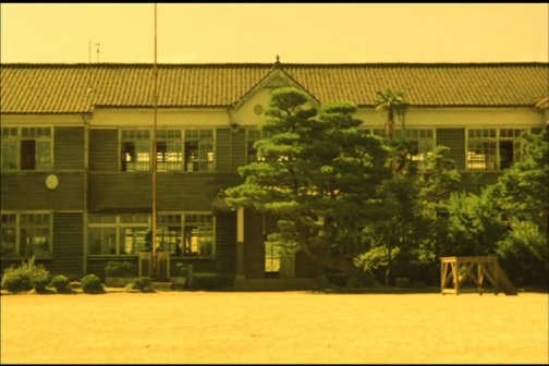 The inside fits the normal appearance of Japanese schools, although it's obviously a little run-down. Kids lean out the windows to watch Shinji.