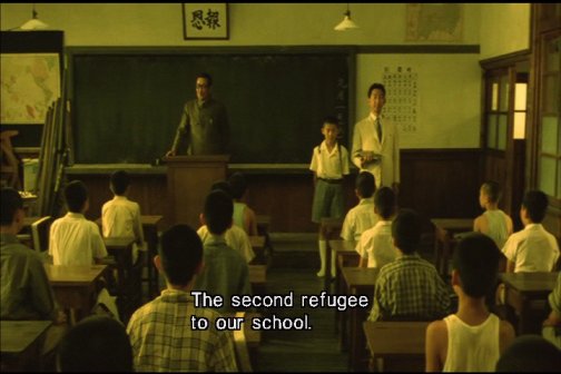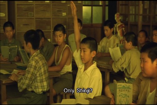 One of the kids has found out that teacher and student refugees from Tokyo will be coming before long. He interrupts Shinji who is telling yet another story.