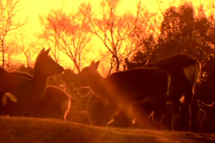 The next day he's out early. He sees two deer bow to another one.