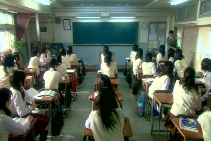 His classroom. It looks like there's around thirty students in the class.