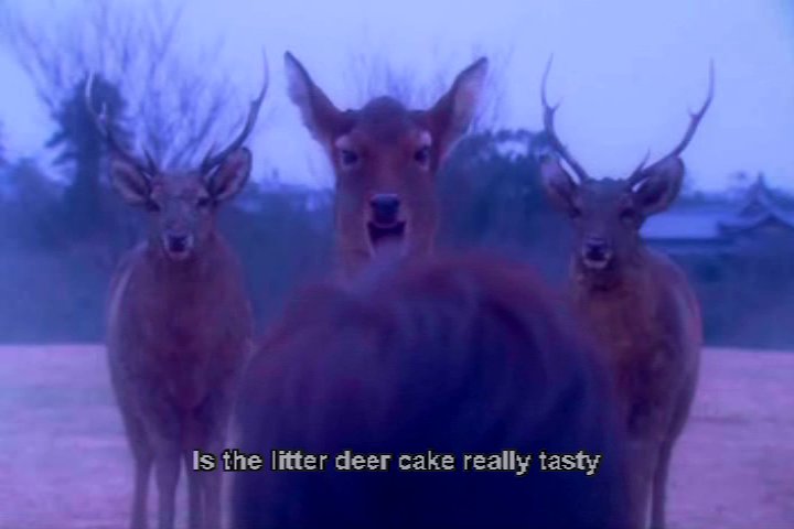 Her excuse for being late is that she had to park her deer somewhere. This also shows just how bad the translation is in this version of the movie. The girl also claims that people ride the deer.
