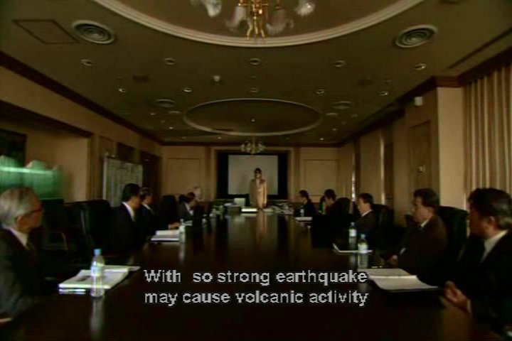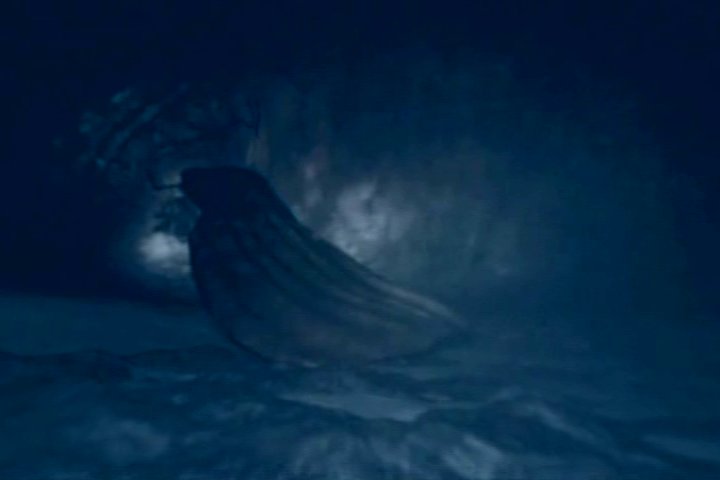 This is a scene shown several times. The center object resembles a fin or a tail. It moves, and an earthquake results.