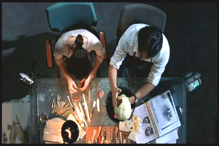 They are still working on the skull. Simulated muscle tissue is being applied after some other things have been done. Jung makes some mistakes, though, and Lee chastises her and explains what she's done wrong.