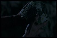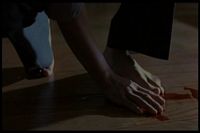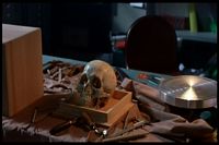 It's now nighttime. He apparently still refused to work on the skull, though it's still in his workroom. The box it's in makes noises and opens by itself. He looks in and sees a partial Sadako-like face, then later finds blood on the floor of a different room. Then a strange form appears in the room.