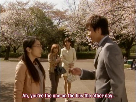 Later a guy puts his hand on her shoulder and Yamaguchi starts to twist his arm. She then sees the guy from the bus and hides behind him, pretending to be afraid.