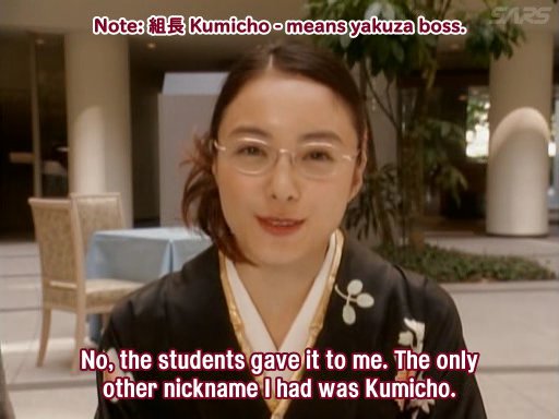 Yamaguchi's room at home. One of the guys there wants her to give up teaching and become head of the Yakuza family she's in, but she wants to stay a teacher.