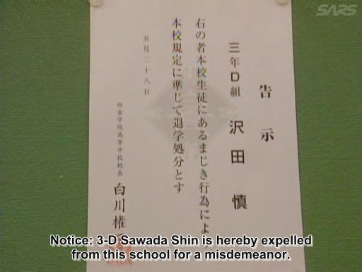 Sawada is arrested by the police and expelled from the school. (Note: this is possible in Japan, but not really in the U.S. Japanese schools sort of feel they hold a responsibility for students even when they are not on school grounds, whereas in the U.S. schools don't, and a student who gets in legal trouble but for something off the school grounds is not punished by the school.)