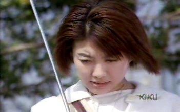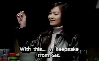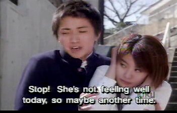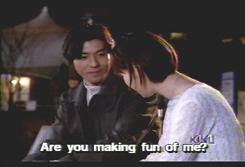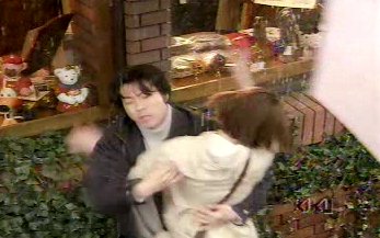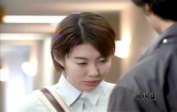 The woman (Mayuko) is talking to a man (Shinichi) and staring at something. She doesn't see a bicyclist speeding along the sidewalk and Shinichi grabs her and keeps her from being run over. Afterward she just sort of wanders off.