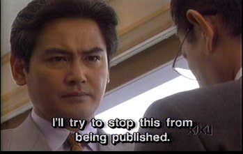 The politician, who obviously crawled out of the Bog of Eternal Stench, tries to fake out Mayuko's father, claiming he will stop publication of some article about Shinichi even though he's the one who got the reporter to write it in the first place. The implications the article makes would involve Mayuko and her father, indirectly, I assume.
