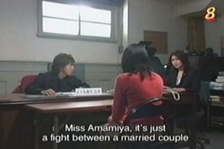 Kuryu is talking to another wife claiming her husband assaulted her with a "chopper."