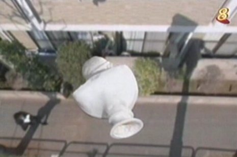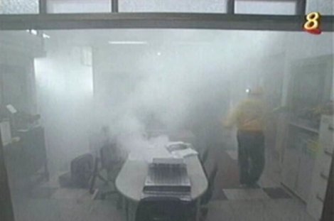 A guy sets off a smoke bomb in the office and starts tearing things up. He does a good bit of damage and runs away.