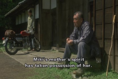 There's a major thunderstorm and Akira and Miki take shelter in a cave. She recounts how, when she was younger, she fell for the wrong man (something which becomes very important later in the film) and ended up getting pregnant. She was told that her baby died during birth.