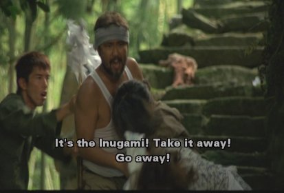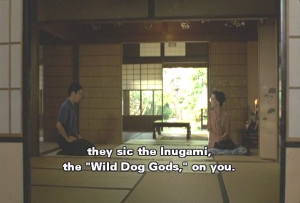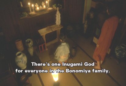 Inugami, according to the back of the dvd, are evil dog spirits. They are protected by women from the house of Bonomiya. Miki, a middle-aged papermaker in a remote village, and Akira, a new, young school-teacher, are the major characters.