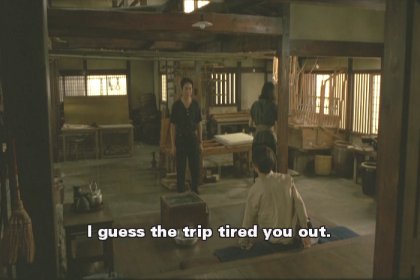 He comes to at Miki's house. (Actually, the entire process of how she makes the paper is quite interesting to watch. The scenery shots so far in the film are also very beautiful.)