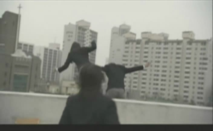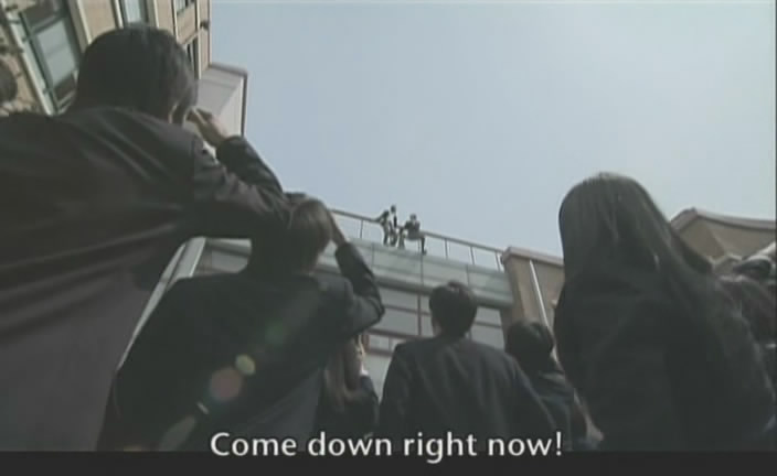 A couple of teachers arrive. The class president runs towards the two, trying to stop them, but they both jump.