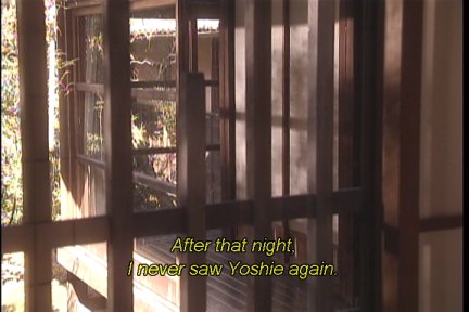 In the past he visits the mother after Yoshie's death and she tells him Yoshie had a sister. They both had typhoid, but her sister died from it. He finds out what the “other half” she was trying to find really was, and that the girl he slept with in the shrine was not Yoshie, but her dead sister.
