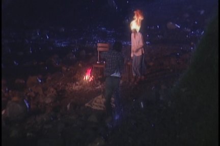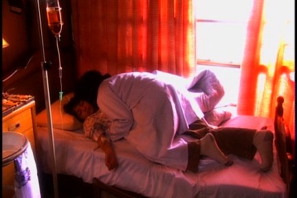 Somehow her head has become engulfed by flames. She's terribly burned, he tells he she can have the burns and cuts her head off. He keeps her body in the house hoping her head will regenerate (yet he doesn't have the body hooked up to any medical equipment; there's no source of nutrients for it, etc.)