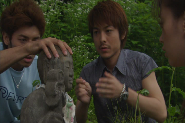 They go back to the camp site and replace the statue's head, gluing it in place. They also pray before the statue.