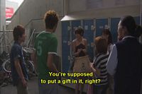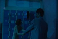 She opens one of the lockers and indicates to him he should look inside. (She hasn't made a sound the entire time.)