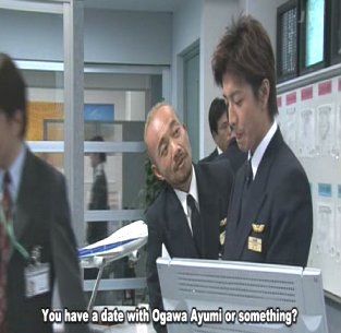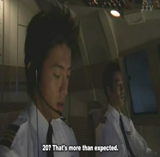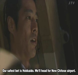 Koda and Shinkai talk about what they can do about trying to land at their primary airport, Narita. Koda says they will land elsewhere, take on some fuel and then take off again for Narita.