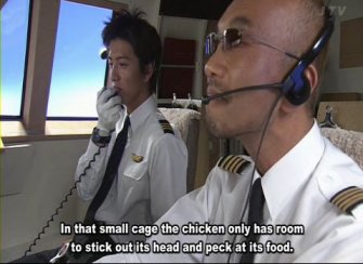 Ogawa is the last passenger (she must have been going through emotional terror during the drill). She goes down the shut but lands roughly; Koda starts to go after her and trips; Shinkai blocks him from falling but, in turn, falls over the side of the chute onto the hard floor.