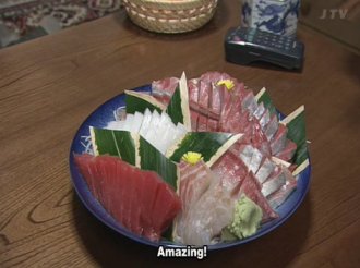 Shinkai's father prepares some sashimi for Shinkai and Ogawa.