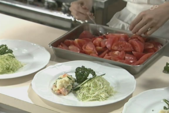 Natsumi has made a mistake of putting 3 pieces of tomato on a plate instead of 2, so Jun runs to get more tomatoes so Yujiro won't find out about her mistake.