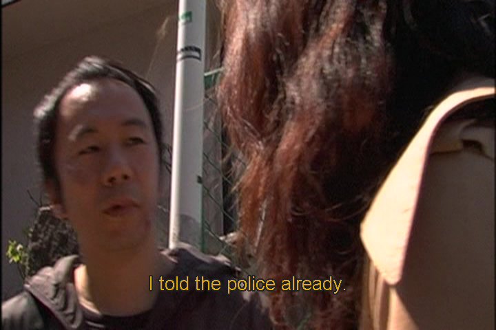 He gets beat up by a guy who breaks his camera. He then goes back to his apartment building and sees the one woman outside.