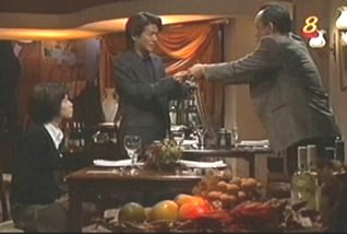 Hiro introduces himself to Sam. They are doing the traditional Japanese thing of exchanging business cards. This is a much more formal practice then how it is done in the U.S. For example, you are to hand the business card to the other person in a set fashion; the receiver is supposed to look at the card and admire it and carefully place the card in the regular business card holder he carries. No stuffing a card in a shirt pocket or anything like that.