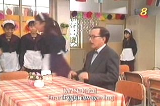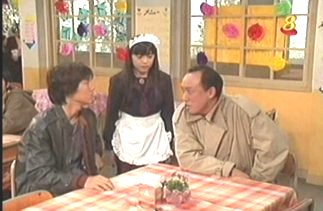 Nakata comes to Satsuki's school. The students are having their own version of a restaurant which can happen during the cultural days, etc, when different classes have different themes. It's very common in anime. Satsuki is away from everyone, leaning up against the door, but all the girls are dressed in the same uniform.