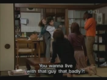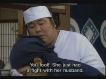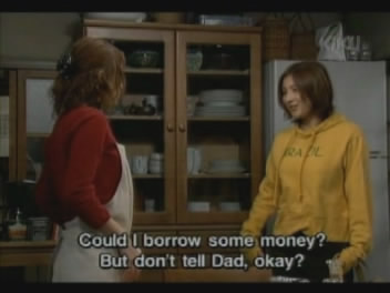 Makoto gets home. All three sisters are there, quiet. Her father is there with arms folded, and tells her to sit down. Shiro is mad at her for working at a hostess bar.