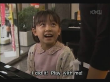 Kei stops at a store to help a young girl that's having trouble playing the piano.