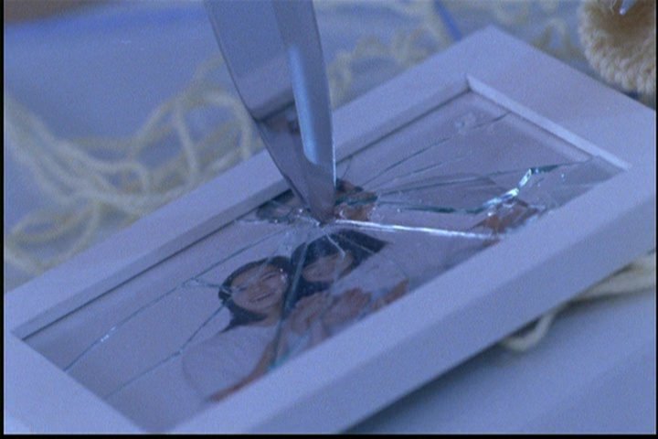 The girl has stabbed a photograph. She then runs away.