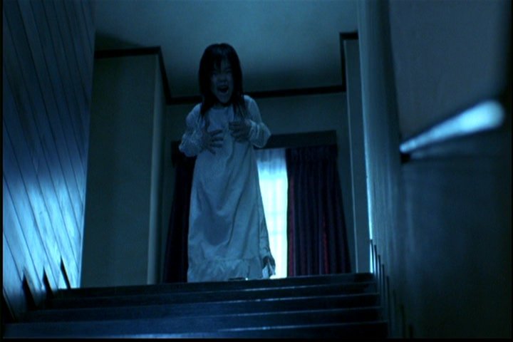 Young-ju is standing at the top of the stairs, about to throw herself off. (And the very young girl does some extremely good acting here, and actually in the rest of the film, too. ) She ends up falling down the stairs but is not killed.