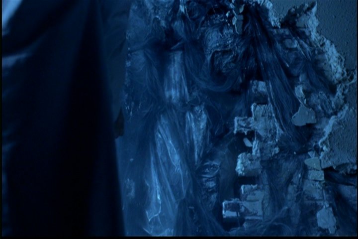 She pulls on the line and the wall, which is very thin, splits open, revealing a body behind it.