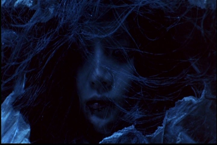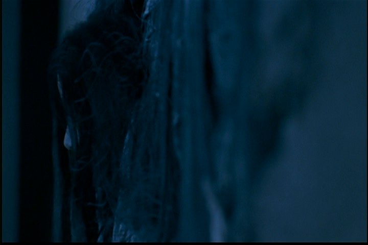 She's at a sink washing her hands and some hair comes out of the facet. The mirror shakes, and she sees another face in the mirror.