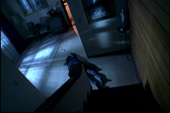 She's hanging onto the railing, dangling over a long fall. The phone rings and the guy answers it. He hears the noise and screams.