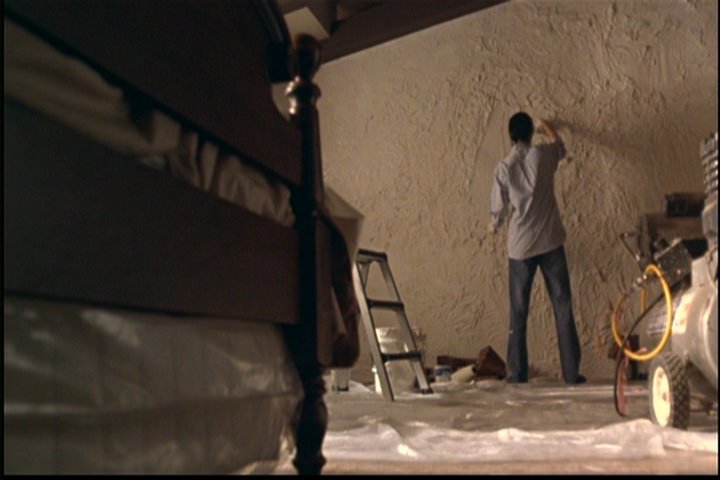 The wife finishes the fake wall.
