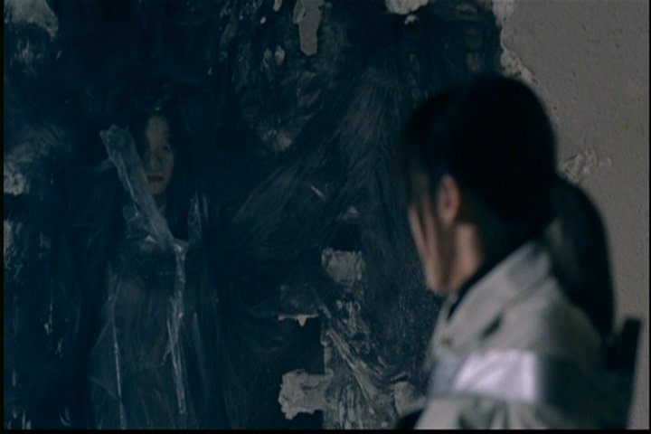 The wife pours gasoline on Jin-hee and Ji-won but before she can set fire to them Jin-hee starts to come out of the wall.