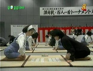 One person sits on each side of a mat. On the mat are numerous cards with poems (I assume) on them. The narrator reads a poem, and the person has to pick the card that either is the poem or has something to do with the poem, or something like that.
