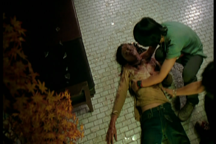 The one guy is seeming the woman crawling towards him and no one is noticing that he's freaking out. He just happens to be carrying a loaded guy and fires off several rounds in the air (why in the air?). Then he kills himself.