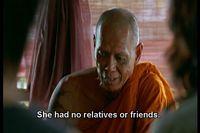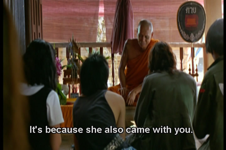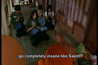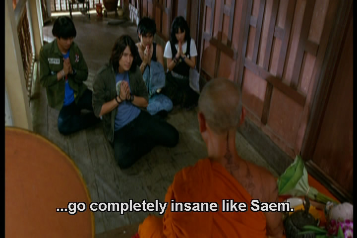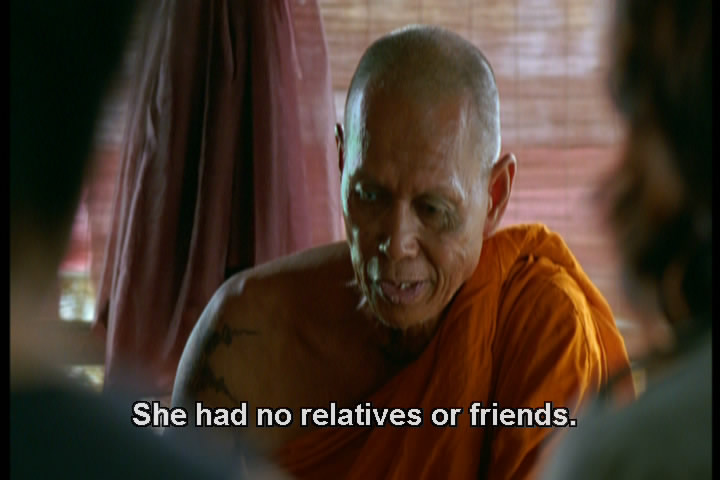 Suddenly they all decide to go and talk to a Buddhist monk. (Why? Did they know him? ) He says the temple cremated the woman, minus her head.) Yet there's a guy there that found the head and went insane.