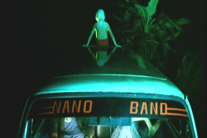 The strange kid is riding on top of their van. (And there has still not been given any explanation for the kid's existence.)