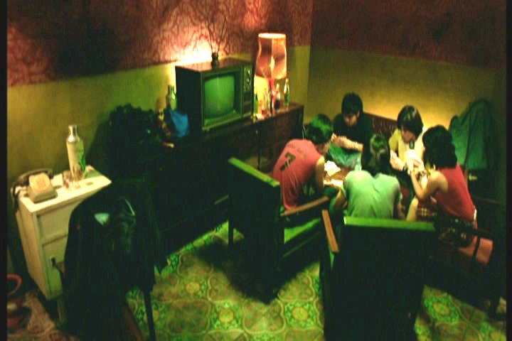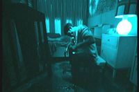 There's a piece of white cloth hanging down. I think the events were in the same apartment as the musicians, but in the past.