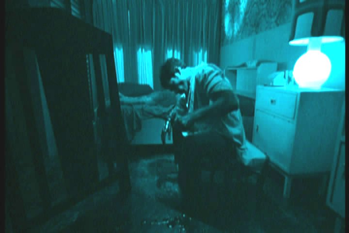 Back at the house, the murdered woman is crawling out from under the bed after the guy that's chained up in the room. Apparently it's the father who had sex with the murdered woman when she was still young and living at the house.