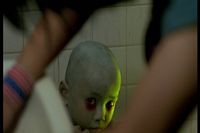 No idea on this one. When the guy leaves the restroom he has to drag his leg because the kid, who he can't see, is holding on to it. (The kid continues to appear throughout the film)