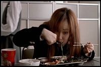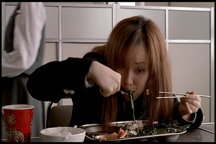 Later, in the cafeteria Hae-ju is eating as fast as she possibly can.