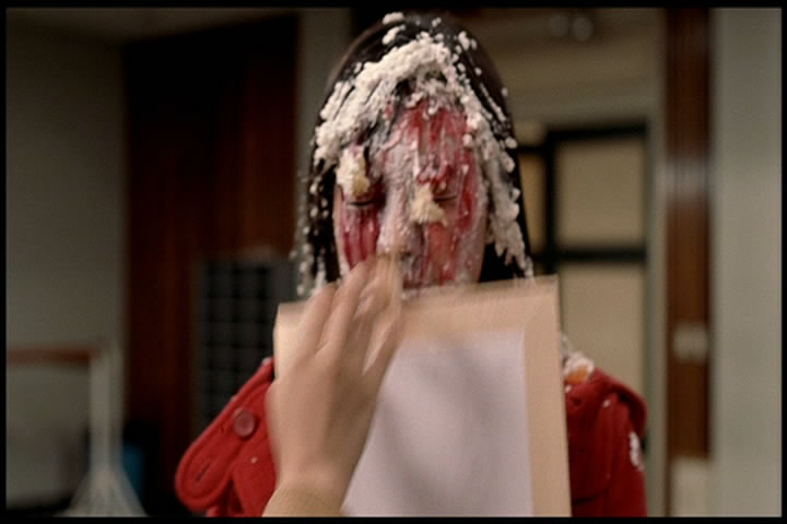 It's not as friendly as she thought. They take the cake and hit her in the face with it.