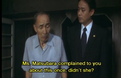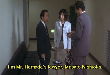 Yoshima's attorney takes the manager and agent upstairs to see how badly the apartment is damaged.